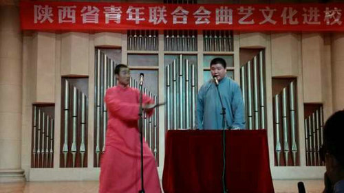 今年8月,在共青团陕西省委的指导下,省青联专门成立了以服务全省广大青年为己任的青联艺术团,艺术团以青联文艺界别委员为主,和社会各界文艺力量一道组成为一支为繁荣陕西文化发展而努力的青年文艺团体,此次“相声大会”就是“曲艺艺术进校园”的首场演出。