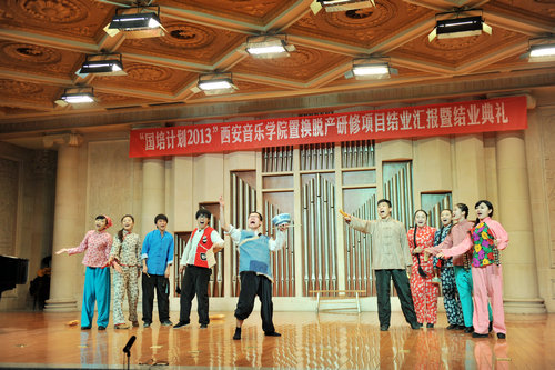 在陕西省教育厅、陕西省国培执行办的高度重视和关怀下,“国培计划2013”置换脱产研修项目的学员们在我院进行了为期三个月的学习。本期置换研修项目共完成512学时,邀请一线专家举办讲座八场,安排教育教学基地实训学习三次,还组织了多次班级的文体活动。学院对于本次国培项目十分重视,培训内容丰富、有实效,主要侧重于提高学员音乐教育教学实践以及专业基本功的发展,传递最新的音乐教育教学理念和方法。来自陕西省各地市中小学的优秀音乐教师,经过三个月的学习研修,教学技能和理念均取得了长足进展,学员们的学习汇报精彩纷呈。