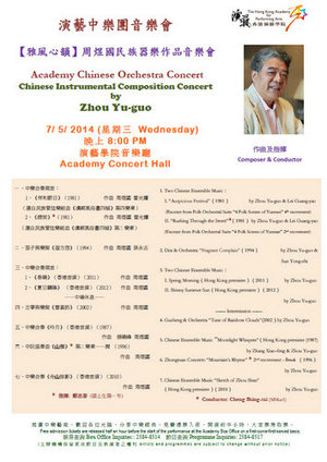 5月7日晚,由周煜国执棒,演艺学院中乐团演绎的《“雅风心韵”-周煜国民族器乐作品音乐会》在演艺学院音乐厅隆重上演。音乐会演出了周煜国十一首民族管弦乐作品,协奏类三首,合奏类八首,其中十首作品均在国内各类重大赛事中获得奖项,六首作品为香港首演。演出得到了当地机构和各界人士的重视和关注,香港演艺学院音乐学院院长蔡敏德博士、中乐系主任余其伟教授、古筝许菱子女士、香港爱乐民乐团艺术指导/首席指挥何文川先生、团长陈文颖女士亲临了音乐会,香港中乐团孙永志、朱文昌、辛小玲、辛晓红、崔灿、葛杨、张莹、高山等其他社会各界艺术家及内地爱乐人士光临了音乐会现场,并为音乐会带来了热情的祝福和声援。音乐会现场座无虚席,长达120分钟的音乐会,在热情洋溢、欢快明朗的返场曲“惊涛”声中圆满落下帷幕。音乐会后嘉宾们纷纷评价:“周氏以高超的艺术境界及忠诚尽职之操守给我们乐队深刻教诲……期望多出佳作,后会有期。”“音乐中充满了历史感和意蕴,秀美而苍茫……余音绕梁,令人难忘!”“整个乐队排练合乐及演出阶段,接触到老师优美的作品,指挥大气自然,流畅的音乐呈现出巨大的内在力量。”