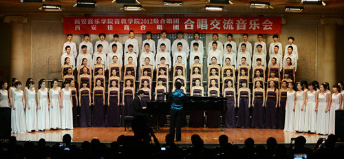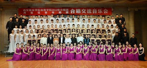 西安佳音合唱团(陕西教育工作者合唱团)是一支由从事大中小学音乐教育的教师组成的合唱团体,其中60%的成员为我院校友,此次合唱交流音乐会他们分别演唱了《如鹿切慕溪水》、《圣母颂》、《正是我所盼》、《橄榄树》、《青春舞曲》、《月亮代表我的心》六首合唱曲目,领唱,石油大学艺术系主任程辉(校友),指挥为西安电子科技大学艺术教育中心主任周伟副教授(校友);西安音乐学院音教学院2012级合唱团演唱了《天空之城》、《甜蜜蜜》、《菊花台》、《丝路回声》、《不朽》、《站起来》六首曲目,指挥,我院青年指挥梁晖。