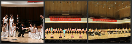 歌声、琴声、欢迎声,声声悦耳,亲情、友情、师生情,情情暖心。音乐教育学院精心准备的20余个节目分别代表了学院教育的各个侧面,音乐会以声乐演唱、钢琴演奏为主体,综合呈现了合唱、民族乐器、西方乐器选修、音乐教育新体系表演等音乐教育学院现行学科成果,全面展示了入学后新生所要面对的专业学习情况。音乐会既给人以美的音乐享受,又给新生以主题音乐会“教育先导”的前期体验,展现了学院在音乐教育技术至上理念下的全能教育新发展的思考。