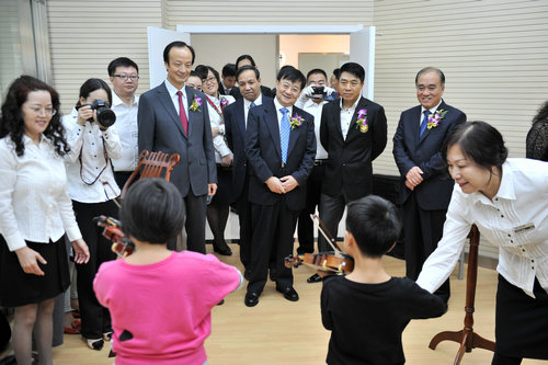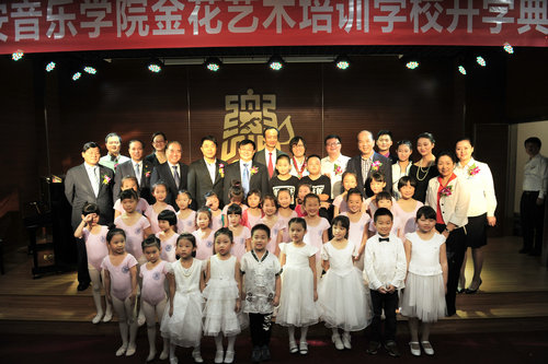 2014年9月27日,“西安音乐学院金花艺术培训学校” 开学典礼在世纪金花赛高购物中心隆重举行。我院党委书记李映方,党委副书记、常务副院长孙卫国,金花投资集团董事局主席吴一坚、荣华集团总裁崔荣华等出席了并为金花艺术培训学校揭牌;我院纪委书记王平、副院长安金玉、世纪金花股份有限公司总裁宋红、集团常务副总裁曲家琪、副总裁孙圣明、总工程师张培合、集团人事行政总监陈健以及我院相关部门负责人参加典礼和揭牌仪式。