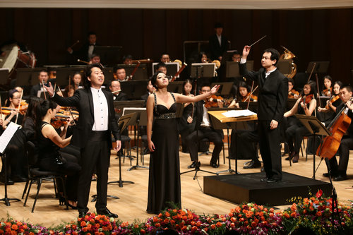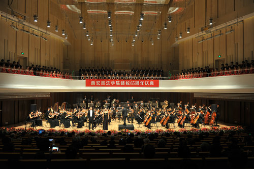 庆祝大会结束后,举行了庆典音乐会。我院师生表演了合唱《陕北风情--情歌》《忆秦娥·娄山关》《柔板》《马其顿幽默曲》《羊角花开》、弦乐四重奏《亚路易斯》《生日快乐变奏曲》、女声独唱《玛依拉变奏曲》、男声独唱《冰凉的小手》、二重唱《饮酒歌》和交响乐《奔向辉煌》。