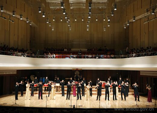 音乐会上半场,由两校学生共同演奏的吹打乐合奏《龙腾虎跃》拉开序幕,气势磅礴的演出阵容、妙趣横生的完美协作,台上台下的频频互动,引得全场观众惊喜连连。随后两校学生分别展示了弦乐合奏《二泉映月》、竹笛独奏《幽兰逢春》、小合奏《草原天地》、唢呐独奏《一枝花》、古筝合奏《百花引》、打击乐重奏《David Mancini 》,曲目编排动静交错,主题鲜明雅俗共赏。学生们争芳斗艳,时而哀婉倾诉,时而奔放豪歌,音乐会高潮迭起,欢呼声经久不息。音乐会下半场由两校学生联合组成107人乐队,共同演绎了6首脍炙人口的民乐经典。《庆典序曲》由唢呐和锣鼓的齐鸣,勾画出节日庆典的欢腾场面;《古槐寻根》以山西洪洞大槐树为主题形象,生动地刻画出游子对故乡的真挚眷恋和返乡时的欢乐情景,用动人的旋律抒发华夏儿女“饮水思源、寻根祭祖”的亘古情怀。《丝绸之路》以展示中西多种音乐元素的融合,通过学生们指上的炫舞,绘制出一幅幅金光照耀戈壁、大漠驼铃悠扬的无限美景,更彰显了两校师生以优秀民族音乐文化谱写新丝绸之路文明的凌云壮志。返场曲目《花好月圆》《好汉歌》在两校青年指挥家高伟和于帆的诙谐挥舞中,使整场音乐会在“雏凤”气势恢宏的鸣奏中落下帷幕。