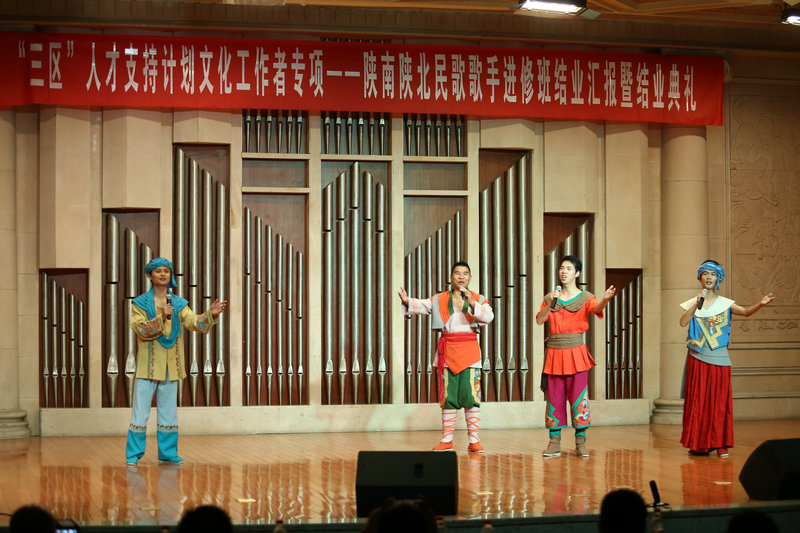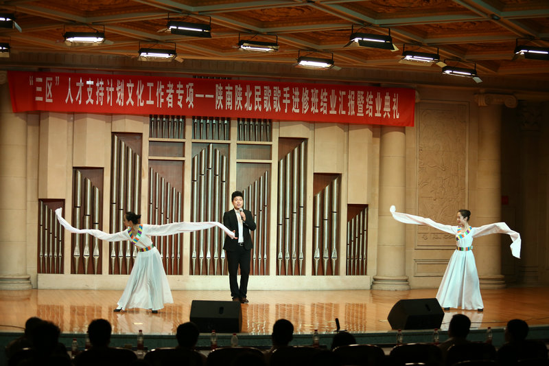 2015年7月3日,“三区”人才支持计划文化工作者专项——陕南陕北民歌歌手进修班结业汇报音乐会暨结业典礼在我院学术厅举行。西安音乐学院党委书记李映方,党委书记副书记、常务副院长孙卫国,副院长王真,党委委员、音乐教育学院院长冯力斌,陕西省文化厅人事处副处长谭佳峰,陕西省艺术馆音乐舞蹈部主任、研究馆员王阿民,延安市文广局纪检组长郑义,安康市振兴汉调二黄办公室主任王军以及各相关部门负责人参加了音乐会暨结业典礼。