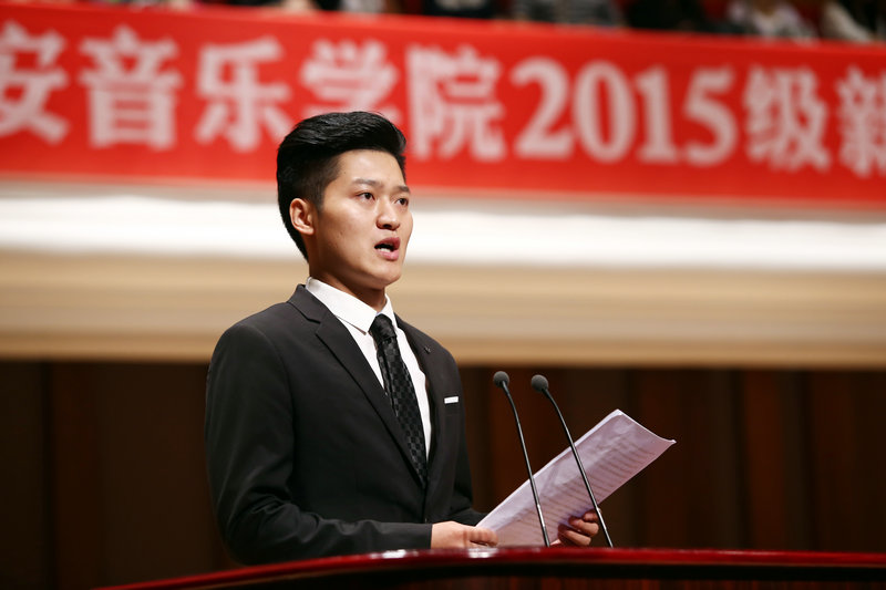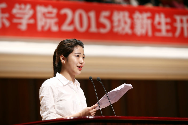 典礼在雄宏嘹亮的国歌声中开始。学校党委副书记、常务副院长孙卫国主持典礼,介绍了在座的学院领导和教授代表。作曲系副教授吴延代表教职员工发言,对2015级新同学的到来表示诚挚的欢迎,与新生们共同探讨大学的学习和生活体会,并就如何搞好学生的教学和服务表明了态度。声乐系2012级学生王琨代表在校学生发言,以自身大学的成长经历与新同学们共勉。管弦系学生张斯洋代表2015级新生发言,表达了对学校的向往和对师长们的感激之情,提出了今后四年的奋斗目标。