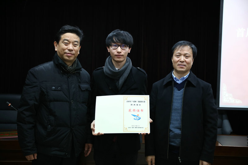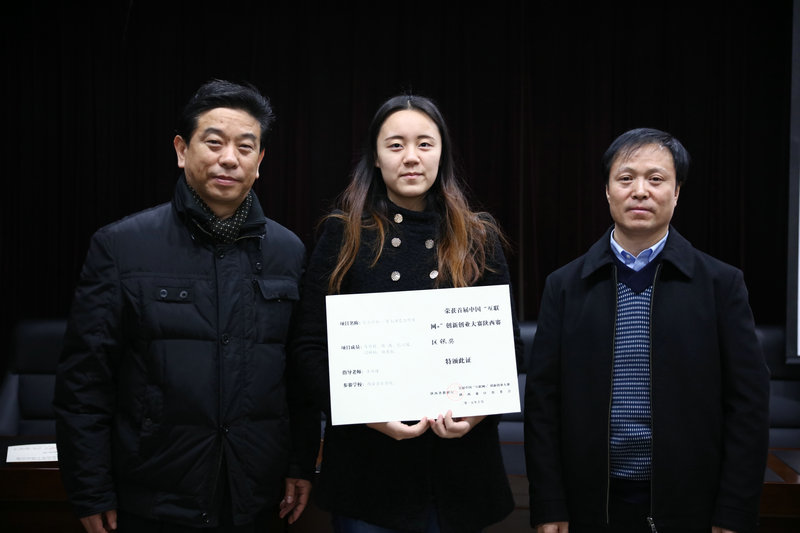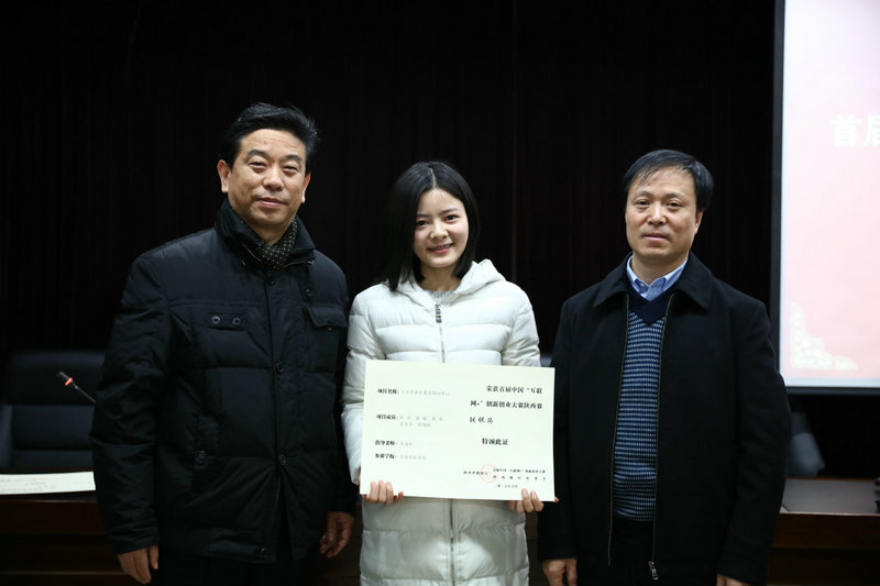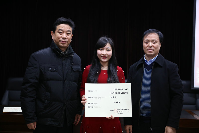 “互联网+”大学生创新创业大赛采用校级初赛、省级复赛,全国总决赛三级赛制。经陕西赛区组委会评议,我院4个项目在此次省级复赛中分获陕西赛区金奖1个(项目负责人:雷璐阳,指导教师:谭艺民)、银奖两个(项目负责人分别为:张洋、马雪颖,指导教师分别为:王延松、王怀瑾)、铜奖1个(项目负责人:任佳宁,指导教师:冯捷);同时,我院获首届“互联网+”大学生创新创业大赛陕西赛区“优秀组织单位”奖。