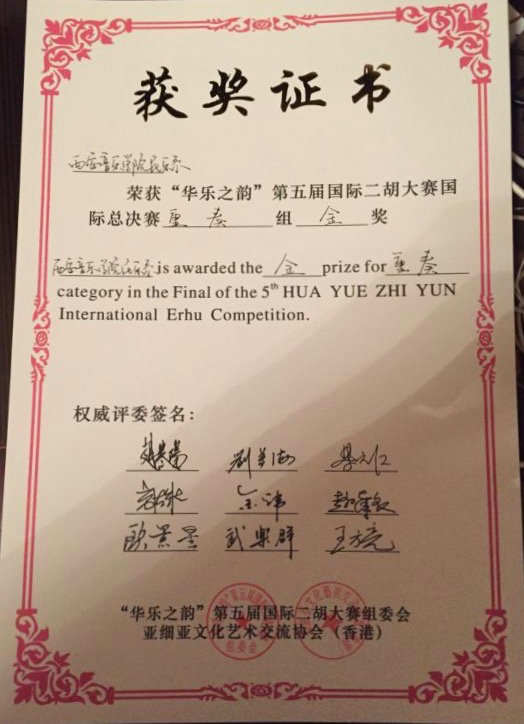 2016年3月11——14日,“华乐之韵”第五届国际二胡大赛,在韩国首尔落幕。比赛由香港亚细亚国际文化交流协会、韩国文化交流中心、日本二胡振兴会、新加坡二胡学会联合举办,我院金伟教授应邀担任大赛评委。近百名来自中国大陆及香港台湾,新加坡,日本的选手在韩国进行了总决赛。由西安音乐学院、陕西师范大学、西京大学组成的陕西代表队(金伟带队)成绩斐然,共获得专业青年A组1金5银,专业青年B组1金1银,特殊拉弦组1金1银,重奏组合组1金,西安音乐学院获优秀组织奖。