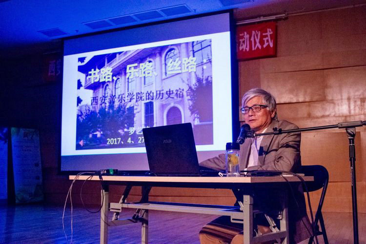 短暂的仪式之后,是罗艺峰教授的主题讲座:《书路、乐路、丝路:西安音乐学院的历史宿命》。罗艺峰以英国学者P.弗兰科潘的《一部全新的世界史》为开篇,通过层层讲解为大家描绘出一副色彩斑斓的丝路研究之旅。