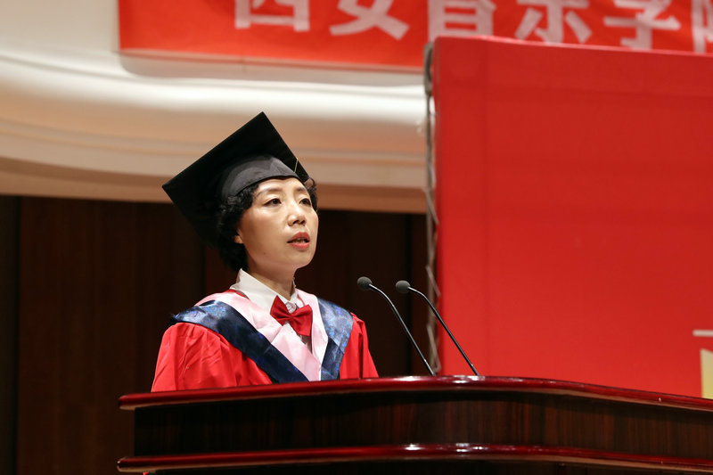 王真代表学校党政领导和全校师生员工,向前来参加典礼的各位家长表示诚挚的欢迎,向顺利完成学业的所有同学表示热烈的祝贺,向辛勤工作的全体教职员工表示衷心的感谢!他回顾了同学们四年大学所走过的历程,对同学们为学校的发展所做的贡献表示谢意;同时,向毕业生们提出了四点希望:一是要坚定文化自信,创作出更多体现中华文化精髓、反映中国人审美追求、传播当代中国价值观念、又符合世界进步潮流的音乐作品。二是要坚守艺术理想,牢记西音人的文化责任和社会担当,珍惜个人的社会形象,在市场经济大潮面前耐得住寂寞、稳得住心神。以深厚的文化修养、高尚的人格魅力、文质兼美的作品赢得尊重,成为先进文化的践行者、社会风尚的引领者。三是要坚持服务群众,运用所学知识创作表现普通人民群众真善美的劳动成果,用有筋骨、有道德、有温度的音乐作品,讴歌伟大的时代,讲好中国故事,传播好中国声音。四是要树立坚毅的生活态度,向老院长赵季平学习,树立“在不被人注意的角落里起飞”的音乐家理想和信念,坚定音乐人的职业操守,敬畏音乐、敬畏生活。下决心从基层做起、从当下做起、从小事做起,努力向实践学习、向群众学习,把平凡的事干成不平凡,把简单的事做的不简单,为推动当地音乐文化事业的繁荣发展做出贡献。王真表示:不管毕业生们飞的多高、行的多远、干的多大,西安音乐学院永远是他们的精神家园,母校期待毕业生捷报频传,永远为毕业生鼓劲加油。希望毕业生牢记“明德教化,乐音至善”的校训,既要仰望星空、志存高远,又要脚踏实地、不忘初心,在实现中华民族伟大复兴“中国梦”的生动实践中,不断谱写出自己优美流畅、激昂动听的人生新篇章。