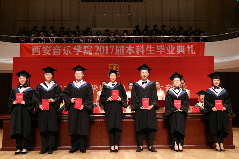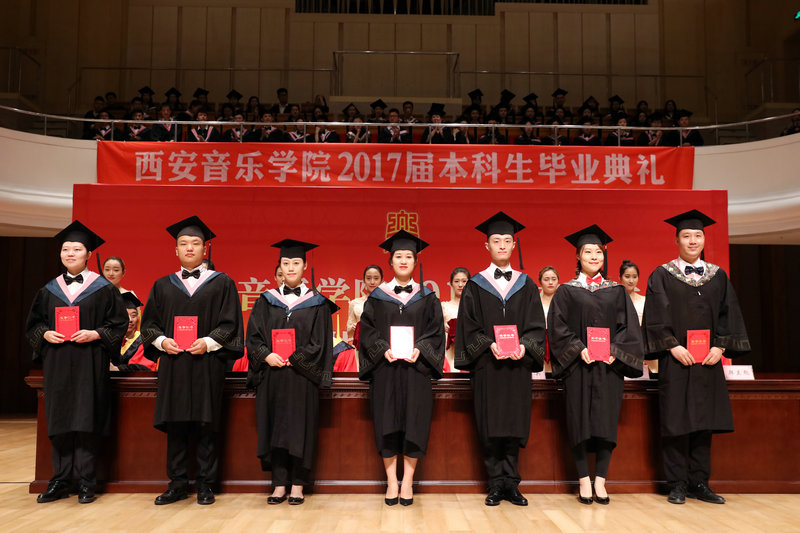 典礼在雄壮的国歌声中开始。冯力斌宣读了《西安音乐学院关于准予2017届王丽珍等940名本科学生毕业、授予艺术学学士学位的决定》;刘正利宣读了《西安音乐学院关于表彰2017届优秀本科毕业生和学生干部的决定》。与会领导分别给获得表彰的优秀毕业生代表、优秀毕业生干部代表颁奖,并给毕业生代表颁发了毕业生证书。王真为毕业生代表正冠扶苏。