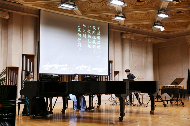 音乐会的另一部全新创作的作品《夜•律》更具有活力,此曲在双钢琴之外加入了民族打击乐器,其灵感来源是彝族音乐与舞蹈。作曲家以十分生动的笔触“描绘”了一段自由恋爱的故事,是一幅少数民族年轻人夜间活动的场景,可理解为“晚间的律动”:当夜幕降临之际,彝家儿女便借着月光与心爱的恋人相互了解与沟通。在夜与律两个场景中,年轻人之间的种种摩擦在节庆活动这个大背景下通过与音乐的结合而产生戏剧冲突。其角色之间的关系在相思、争执以及化解过程中,深刻地展现了爱的传递与表述:对美好事物的追求、对甜蜜与喜悦的渴望,在不同人心中留下了深刻印记。通过三位演奏者精彩的诠释,将这段充满了“意外的故事”表演得惟妙惟肖。