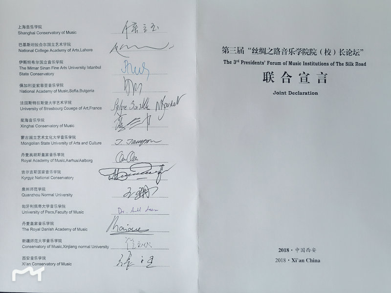 在论坛阶段,与会院(校)长和嘉宾围绕“新时代下全球音乐学院的挑战与机遇;古典音乐在当代社会中的意义与发展展望;‘一带一路’倡议下音乐艺术文化与教育的合作与交流”三个议题,作了全方位、深层次的研讨。在闭幕式上,大家以论坛达成的共识发表了《联合宣言》。宣言称:“丝绸之路”作为全球最为著名的历史动脉,对促进东西方文明发挥了极为重要的作用。“丝绸之路音乐学院院(校)长论坛”通过开展多样而实质性的教育合作,以丝路相连,增进民心相通,实现文化相融,孕育音乐创造的内在活力。大家表示,将以“丝绸之路”为纽带和支撑,以建设“丝绸之路音乐文化学术带”为载体和平台,本着“团结互信、包容互鉴、合作共赢、共同发展”的理念,聚焦高等音乐教育的文化传承功能,用文化连接历史、现实与未来,发掘、弘扬和传播好丝路文明,积极发挥音乐文化传播与交流的凝聚力、融合力、想象力、创造力和感染力,走可持续发展之路,构建“人类命运共同体”。