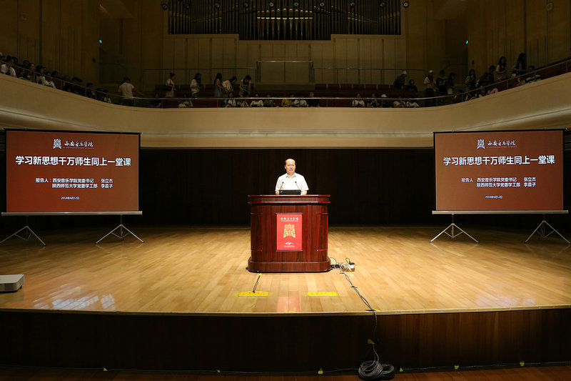 2018年6月12日,西安音乐学院“学习新思想千万师生同上一堂课活动”首场集中授课在我校艺术中心隆重开讲。陕西高校“学习新思想千万师生同上一堂课活动”讲师团成员、我校党委书记张立杰教授和陕西师范大学学工部干部李晨子为广大师生授课。全校领导干部、辅导员、班主任以及师生代表近千人参加活动。活动由校党委副书记刘正利主持。