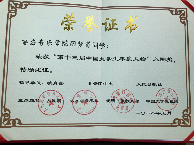 近日,人民网揭晓了“第十三届中国大学生年度人物”入围奖名单,我校民乐系竹笛专业2014级本科生阴梦菲获“第十三届中国大学生年度人物”入围奖。