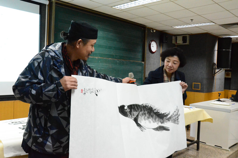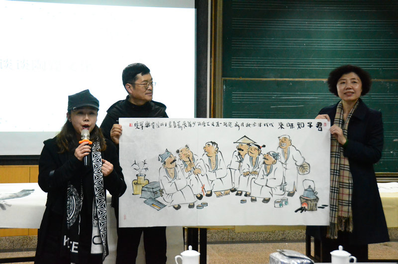 漆德三做了题为“陶瓷与音乐”的专题讲座。漆德三以自己研究陶瓷文化多年的阅历,通俗易懂地介绍和展示了“陶瓷就是中国故事”的内涵。荆志忠根据几十年来对陶瓷研究的心得,讲授了陶瓷文化的历史。讲解过程中,刘勇、熊远堂分别作画,让学生们感受了中国传统绘画的过程,并将作品赠与了学工部。