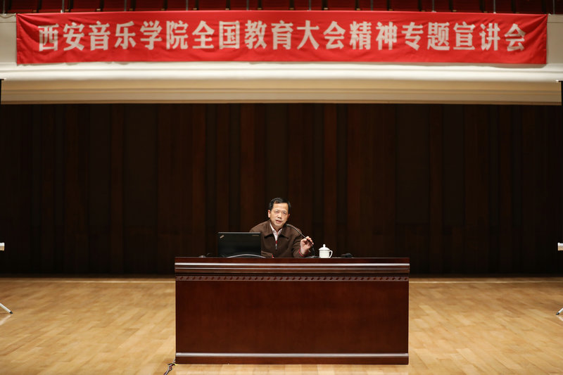 2018年11月19日,西安音乐学院全国教育大会精神专题宣讲第二场报告会在艺术中心举行。报告会邀请西安理工大学马克思主义学院院长鲁宽民教授作题为《坚持立德树人,推进中国特色社会主义高校建设》的主题宣讲。教职员工、本科生和研究生代表参加。会议由党委副书记刘正利主持。
