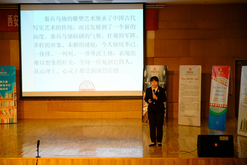 启动仪式结束之后开始了本届读书月活动的第一场讲座,由秦始皇帝陵博物院副院长田静研究员主讲,题目是《秦陵兵马俑的艺术特色》。本届“读书月”活动以“以“开放融合阳光悦读”为主题。通过系列讲座、艺术沙龙、名著改编电影等一系列丰富多彩的活动,引领大家品阅人文历史、了解大千世界、提高个人修养、丰富课余生活。