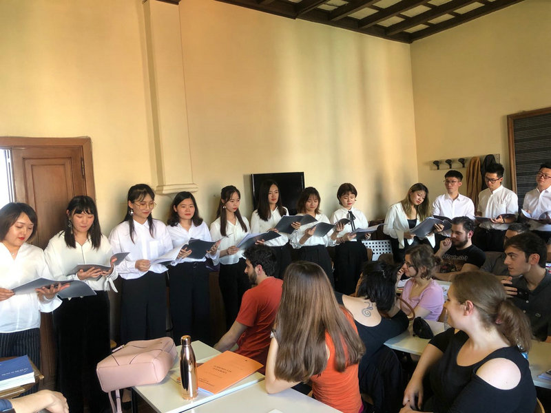 5月23日,视唱团与罗马音乐学院进行了交流学习。首先,大家旁听了罗马院的视唱练耳课程,Maria老师风趣幽默的课堂氛围,形式多样的教学方法,给传统视唱练耳教学模式注入了新的活力。之后,视唱团演唱了《法国视唱》、《茉莉花》及《城南送别》等多首曲目。当耳熟能详的旋律缓缓响彻整个教室,所有人情不自禁地融入到了其中。最后,罗马音乐学院院长带领大家参观了音乐厅、图书馆及整所学校。