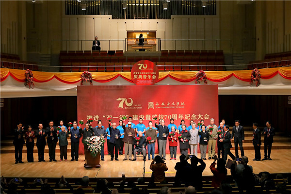 大会上,西安音乐学院还特别为266名离退休老同志制作了建校70周年园丁荣誉纪念牌。在校工作40年以上的16位教师、教辅人员和工勤人员代表全体离退休老同志上台领取了园丁荣誉纪念牌。大会还举行了“双一流”成果汇报暨校庆庆典音乐会。