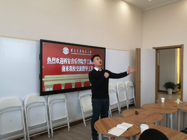 调研交流过程中,马宗方介绍了建筑科技大学学生工作的相关情况,对学生工作处科室设置、工作职责、运转机制、辅导员队伍建设等情况做了详细介绍。大学生心理健康指导中心主任王凯则就学校学生心理育人工作的做法进行了分享。张津波就我校的“思政与艺术的融合”品牌系列活动进行了分享,包括历年来的晚会演出及实践教学走边防等特色育人工作,得到了兄弟院校老师的好评与称赞,并期望能够与我校在巡演事宜上达成合作。团委书记李强对我校团委的基本情况及特色活动进行了介绍,并分享了“歌声中的中国共产党”特色育人工作,用音乐去讲述党史的创意与思路激发了各位老师的兴趣。随后,团总支书记、辅导员组长王潇和郭雯分别为大家现场演唱了《追寻》和《我和我的祖国》。