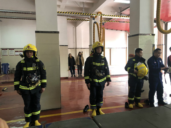 此次活动共有五个流程,分别是参观车辆器材和个人装备,体验消防员装备、参观营房以及了解出警流程。在消防队员们的带领和讲解下,师生代表们学习了消防设备以及现场展示使用方法,并亲身演练。此外,还参观了中队宿舍并学习了解了队史沿革。