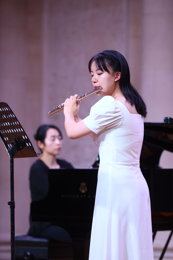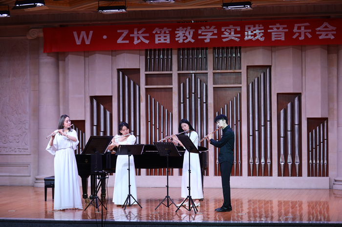 2020年11月7日菊黄时节,学校学术厅灯火通明、长笛声声。舞台上,卓娅、刘宇轩、孔德艺、孙羽裳等四名同学,在《夏日的山谷》里漫游:一幅浸染着大自然音画的田园牧歌图,让我们看见了青葱的山岗,牧童悠然自得地骑在牛背上,吹起了山歌,美丽的绿色、诱人的野花、五彩云霞,撒欢的小鸟,在空谷回声中传来了空山鸟语……
