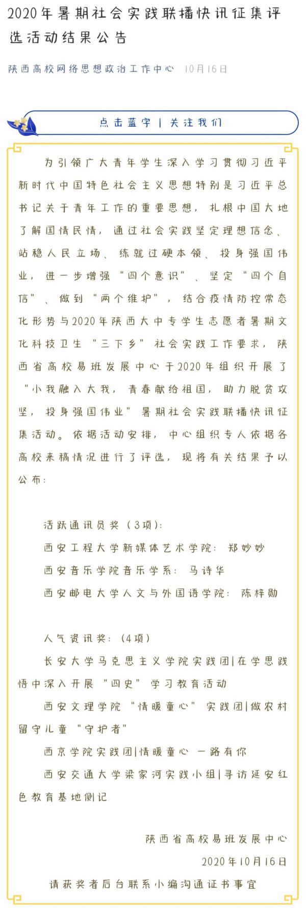 近日,在陕西高校网络思想政治工作中心举办的“2020年陕西高校暑期社会实践联播快讯”征集活动中,音乐学系“三下乡”团队成员2018级学生马诗华获得“活跃通讯员奖”。