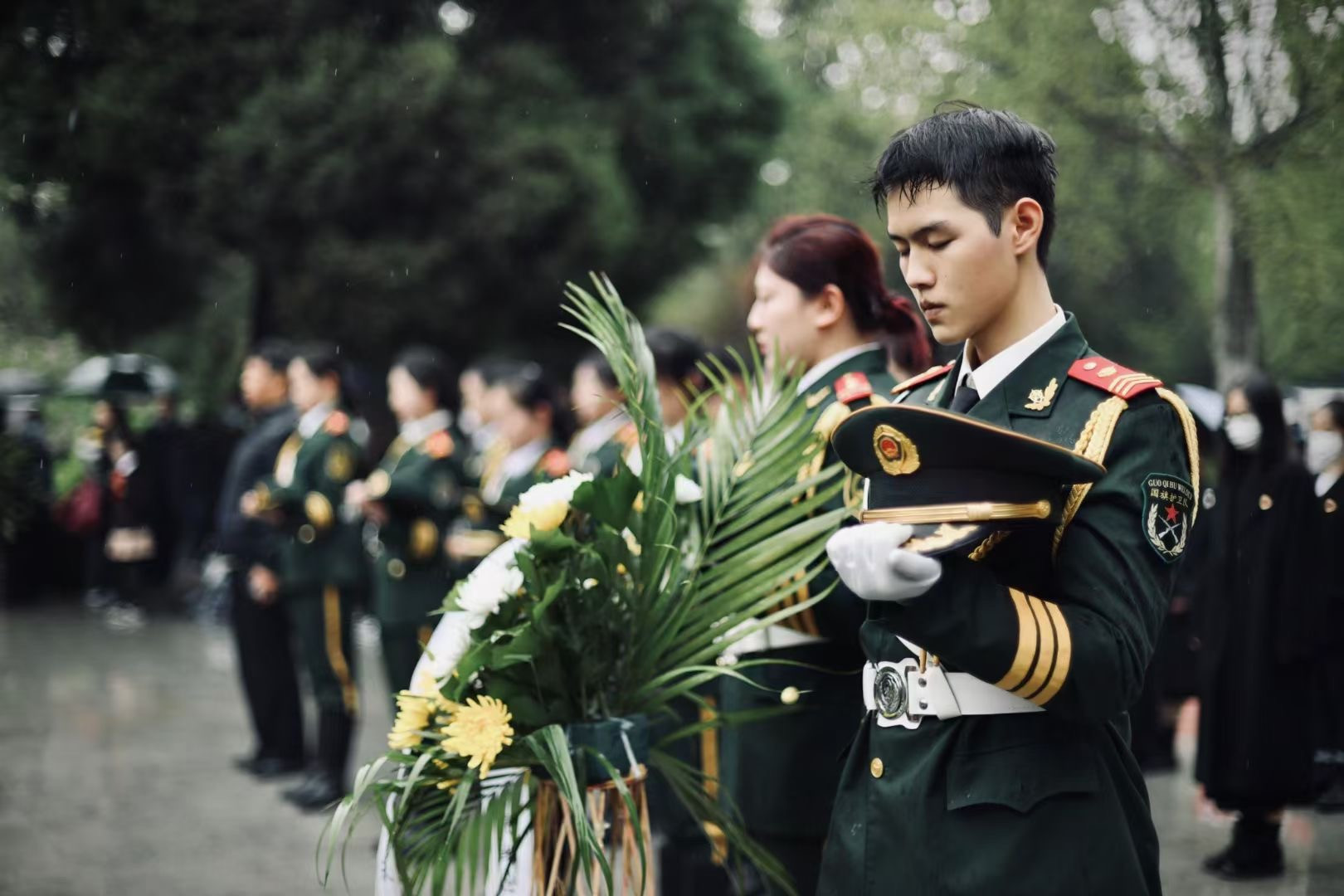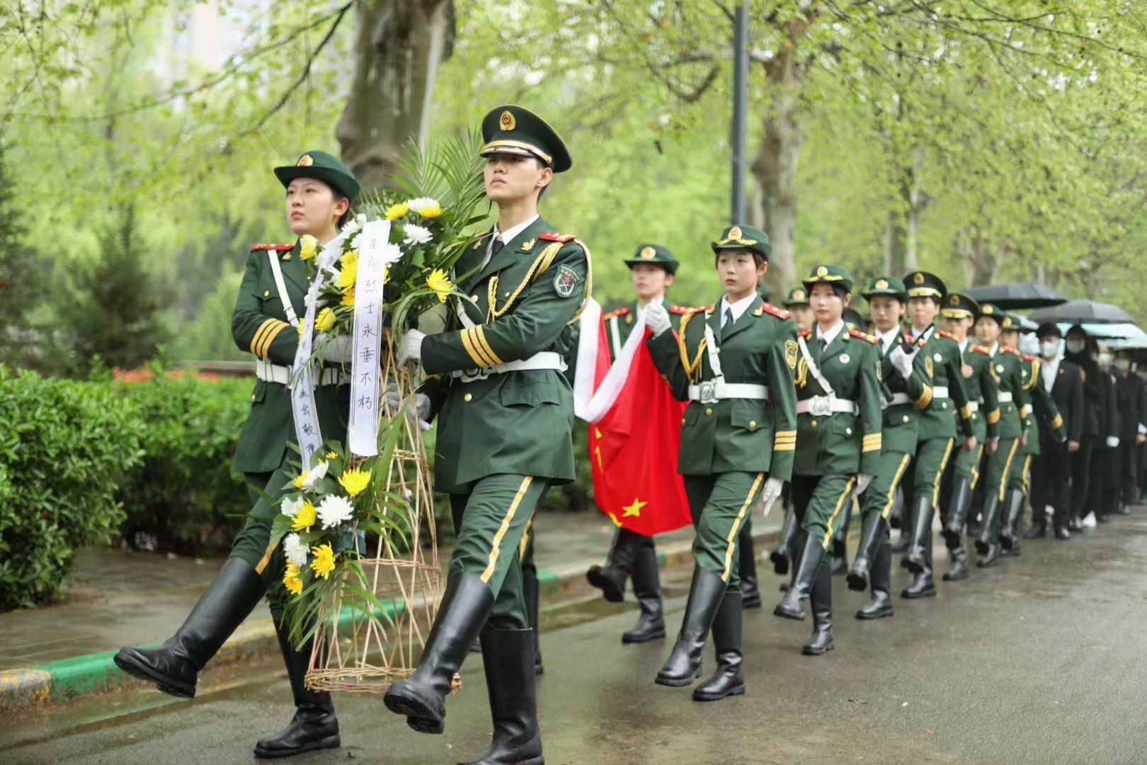 在烈士纪念碑前,全体成员脱帽肃立,向为民族独立、人民解放和国家富强、人民幸福英勇献身的烈士默哀。面对庄严肃穆的烈士纪念碑,每一位同学都心潮起伏,思绪万千。随着口号声响起,西安音乐学院国旗护卫队踏着坚定的步伐缓步走向烈士纪念碑,为烈士敬献花篮。活动举行过程中,许多群众与老兵加入到了队列之中,向烈士们鞠躬敬意。