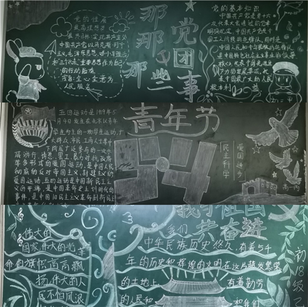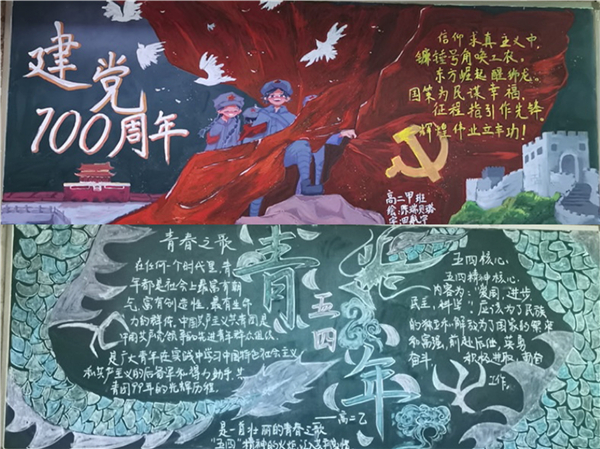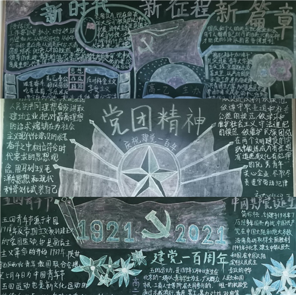 活动期间,参赛班级紧紧围绕着“学党史 悟思想”的主题,在班主任的大力指导和各班团干部积极参与下,充分发挥个人主观能动性,认真准备、精心布置。各班级所出黑板报主题鲜明,内容丰富,形式多样,搭配和谐自然。在绘画过程中,学生通过查阅资料更加了解党的历史,知晓党情,他们用画笔勾勒红色印记,用色彩描绘爱党情怀,用文字歌颂中国共产党的丰功伟绩。板报作品中包括关于共产党建党的相关历史知识、歌颂共产党的诗歌作品、描绘人民幸福生活的绘画作品等等,大量内容在这小小的方寸之间绽放光彩。