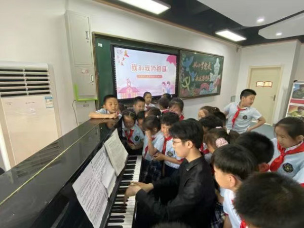 在这堂生动形象具有意义的音乐课中,同学们也十分积极,不断与小老师互动,主动举起小手回答问题,在课堂最后的互动环节中,小朋友们充满热情拥至钢琴前,竖起小耳朵,认真欣赏并跟唱了狄奥承小老师弹奏的《少先队队歌》《卖报歌》等,课堂在轻松愉悦的气氛中结束。