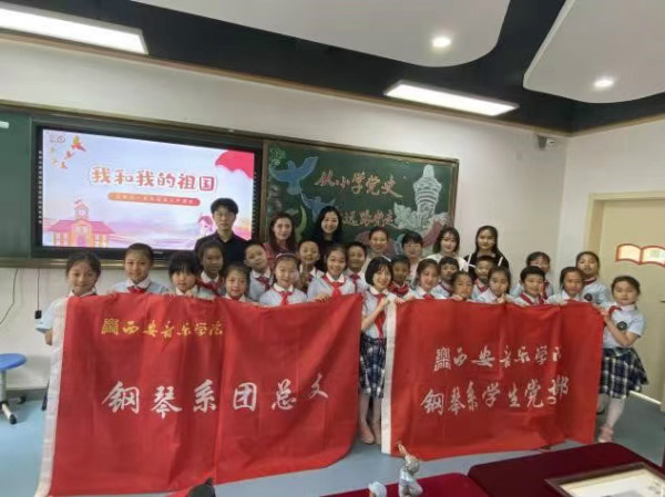 2021年5月20日,钢琴系学生党支部、团总支赴西安市南湖小学开展“百年礼赞心向党,红色音乐进课堂”主题活动第一期,为孩子们宣讲红色故事,带领小朋友们以红色基因为主线,随音乐感受革命热情,回望峥嵘岁月,致敬革命先烈,礼赞伟大祖国。