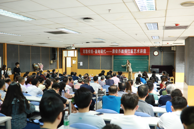 讲座中,唐俊乔教授深入浅出地讲解了中国民族乐器演奏传统与现代的意义,从技术、音乐、审美等多个方面进行剖析,向大家阐释了她一直以来所探索和坚守的“背靠传统面向现代”的演奏与教学理念。唐俊乔教授讲到,现代艺术是建立在传统艺术的基础上的,只有学好了传统作品才能更好地诠释现代作品。随后,唐俊乔教授的学生分别演奏了传统作品《二凡》《行云流水》和由当代青年作曲家近年来新创作的竹笛作品《天际》《归去来兮·雪山之恋》等,这些作品集中体现了当代中国竹笛在继承与发展中的新形态与新高度。唐俊乔教授的讲座生动入微,现场不时响起阵阵掌声,结束后,听众纷纷表示受益匪浅。