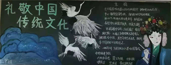 活动期间,参赛班级紧紧围绕“礼敬中华优秀传统文化”的活动主题,根据中华传统文化中经典元素自主设计、制作教室板报。学生们或以京剧为主题,或以爱国故事为背景,既有爱国主义成语诗词,也有典故及时代新解。学生享受并体会传统文化魅力给予的熏陶、感染和教育,感受民族自豪感与家国情怀,更好地促进了班级文化建设,让中华传统文化在班级中生根发芽。