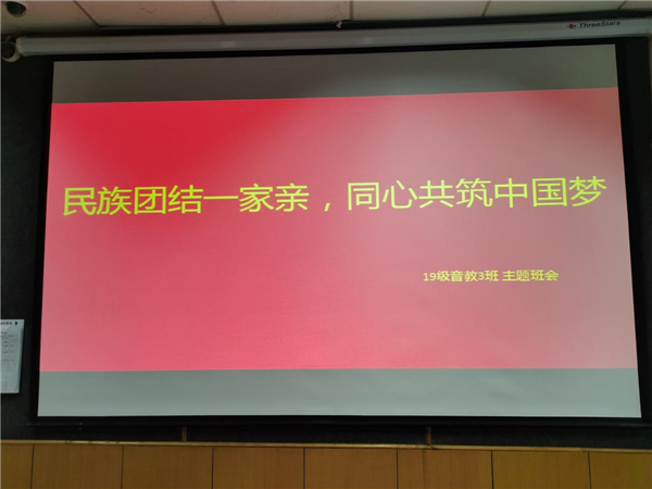 19级音教3班开展了“民族团结一家亲,同心共筑中国梦”的主题班会活动。活动以爱国主义教育为核心,班干部与团支书副书记一起为大家讲解“民族团结一家亲,同心共筑中国梦”的含义,学习理解习近平总书记的指导思想,加强各民族同学交往、交流、交融。进一步巩固和提升班级内部的各民族团结进步创建水平,促进各族学生团结友爱、勤奋互助、自强不息、励志成才,让中华民族大家庭中像石榴籽一样紧紧抱在一起,努力成为德智体美劳全面发展的社会主义事业建设者和接班人。