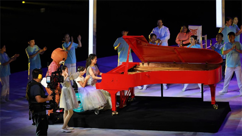 20时45分,全场观众屏气凝神,数千双眼睛注视舞台中央的“石榴花海”。开幕式文体展演以《共同的梦》为主题,《温暖》《自强》《绽放》三个篇章依序展开。潘慧娟与9岁的肢体残疾女童悦悦(故事主人公)出演的《沐浴阳光》,将跳动的黑白键演变成残疾人奋力改写命运、拼搏书写人生的场景。潘慧娟高超的演出水准、不怕辛苦的精神受到邀请方的高度赞扬以及现场广大观众的肯定,潘慧娟用她前期训练的辛苦付出收获了甜蜜的果实。