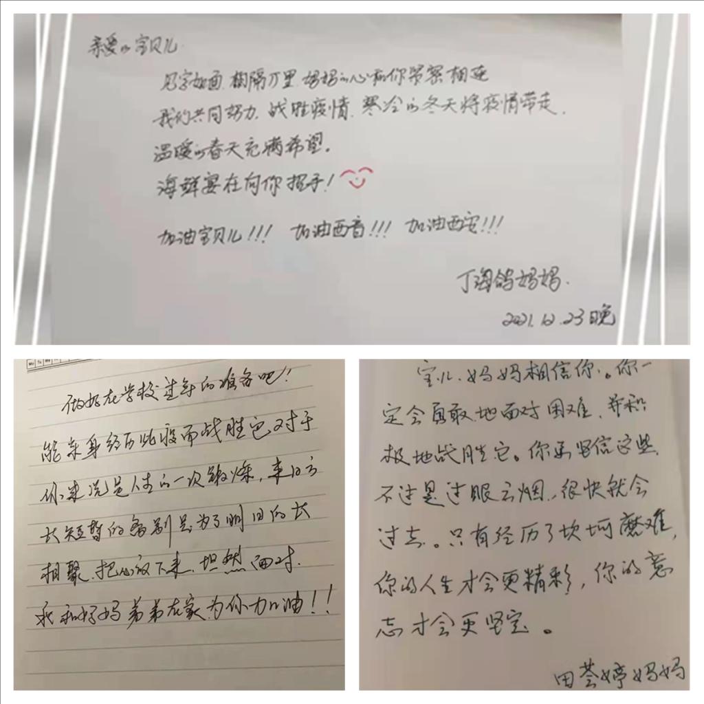 为了给我们加油打气,家长们也纷纷为我们写了鼓励的寄语,让我们做一个坚强的向日葵,不惧艰险不怕困难,嘱托我们听从学校指挥,服从学校管理,为西安加油,为我们加油!