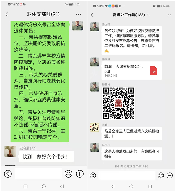 针对疫情蔓延和工作需要,学校于2021年12月29日成立家属区疫情防控工作专班,离退休工作处(党总支)为做好这项工作,发出招募志愿者的通告,总支5名委员带头报名参加到志愿服务行列。许多离退休老党员及离退休人员得到消息后,积极踊跃报名,请求到一线支持抗疫工作。经综合考量和评估,确定了5名退休人员加入到志愿者团队,与年轻人一道不畏严寒每天奔波在校内为教职工服务。