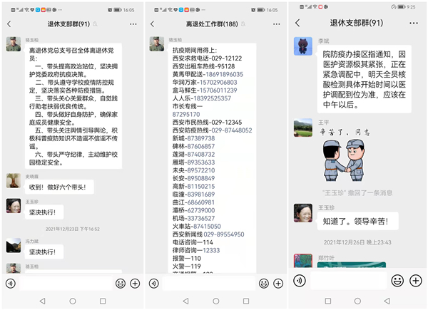 离退休工作处(党总支)在学校封校期间,采用电话关心、微信联系等办法,及时将防控期间核酸检测、就医问药、物资采购、突发事件等相关安排,告知全体离退休教职工,有效解决了民生问题,确保离退休教职工生活不受影响。同时,在疫情爆发期,前往去世老同志家中进行慰问,协助家属办理后事。