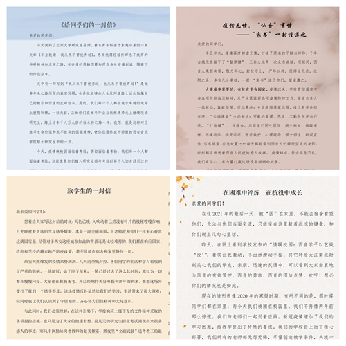 研究生部强化组织领导,压实导师职责和义务,让导师积极参与学生管理工作,充分发挥导师在研究生思想政治教育中的积极作用,及时与学生建立沟通,全面了解学生心理动态和生活情况,有效保障学生身心健康。与此同时,研究生部组织开展《给学生的一封信》征集评选活动,导师们积极参与,踊跃撰写,彭媛娣教授、宁波副教授、程军教授、范文彦副教授、高莎教授、李宝杰教授、杨小龙副教授、姜秦丰副教授、谢宝利教授等导师先后寄来一封封热情洋溢书信,给同学们送来春天般的温暖,照亮了学生们的心田。