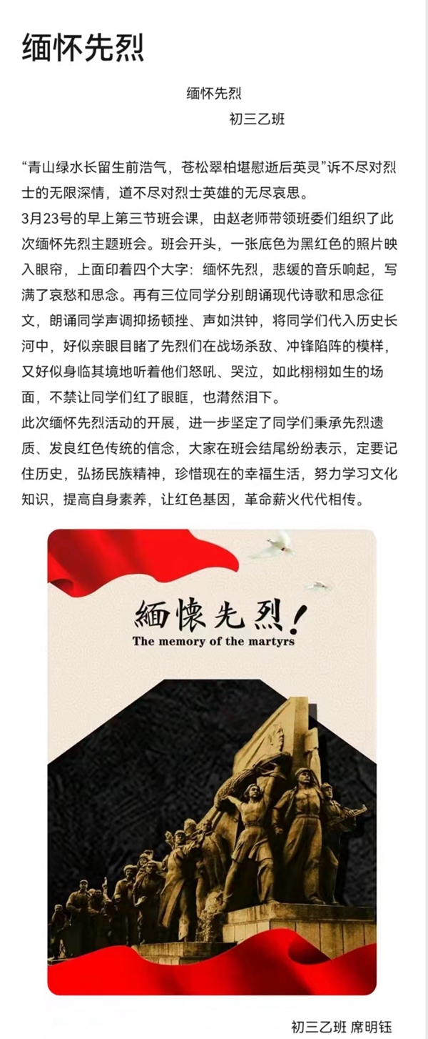 清明节期间,为缅怀英烈、寄托哀思,重温党的历史,弘扬中华优秀传统文化、革命文化和社会主义先进文化,在学校统一部署下,附中积极开展以“党建引领团建 乐音追忆英烈”为主题的清明活动。