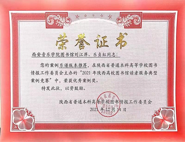 我校图书馆在读者服务工作中成绩斐然。2021年9月29日由陕西图工委主办的“2021年陕西高校图书馆读者服务典型案例竞赛”活动,共收到来自省内28所高校图书馆的读者服务案例118个,经陕西高校图工委服务创新工作组评审,我校图书馆刘江萍、乐贞红两位老师提交的案例《乐谱版本推荐》获得“优秀案例奖”,这也是我校图书馆首次获此殊荣。