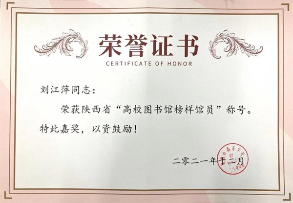 根据陕西省图工委主办的“陕西高校图工委成立40周年纪念暨2021年度工作会议”表彰决定,我校图书馆获得“2012-2021奋进耕耘奖”“优秀案例奖”,副研究馆员刘江萍荣获“榜样馆员”荣誉称号。
