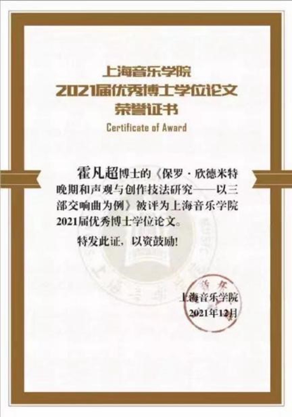 2022年3月31日,上海音乐学院线上举办“2021届优秀博士学位论文颁奖暨研究生学风建设宣讲会”,霍凡超的博士论文《保罗·欣德米特晚期和声观与创作技法研究——以三部交响曲为例》最终获评。该论文属国内首部以德国音乐家欣德米特的“调性功能理论”为研究对象的学位论文,在引入国外相关研究人员大卫·纽梅耶的“五个阶段”分析方法的基础上,创新性地提出了一系列有关欣德米特晚期理论体系与创作实践的观点。
