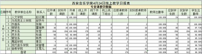 专业小课实开628节,开课率99.37%。其中线上教学323节,线下教学303节,线上线下结合模式2节,线下(结合)占比为48.25%,同比4月20日(线下教学第一天)4.24日专业小课线下课比例增长了36.29%,增长率为303.43%。教师出勤率为100%,学生出勤率为98.38%。