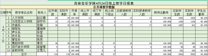 经统计,4月24日,全校公共大课实开116节,开课率100%。其中线上教学34节,线下教学45节,线上线下结合模式37节,线下(结合)占比为38.79%,同比4月20日(线下教学第一天)4.24日公共大课线下课比例增长了27.14%,增长率为232.96%。教师出勤率为100%,学生出勤率为94.06%。