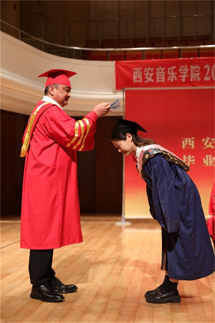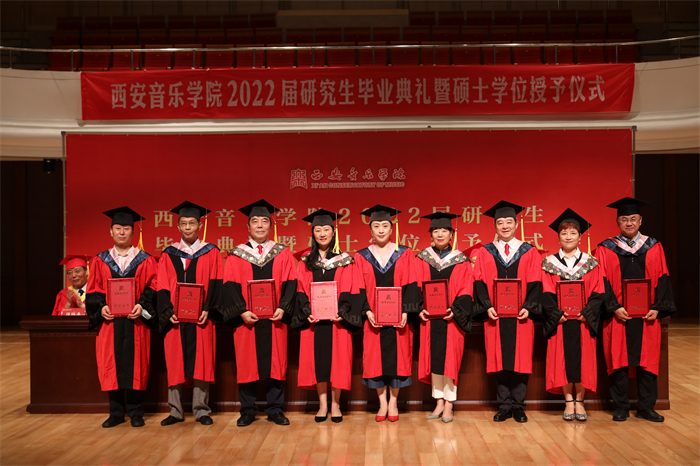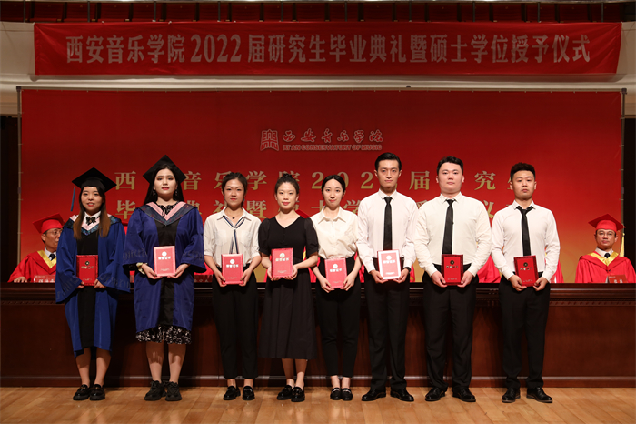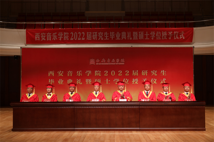 典礼最后,师生齐唱《西安音乐学院校歌》。全体毕业生起立向老师们鞠躬致谢——“谢谢老师,谢谢西音”。全体校领导、老师起立,在《友谊地久天长》的歌声中,目送2022届硕士毕业生离场。