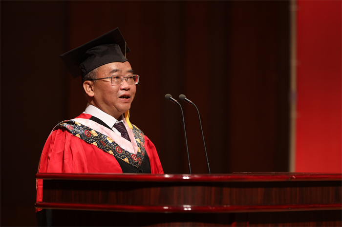 叶明春教授代表全体研究生导师向毕业生表示祝贺并给予嘱托,希望全体研究生继续保持上进心、责任心、爱心、良心、信心,努力做“五心人”。