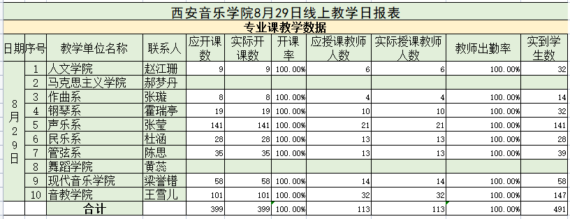 专业小课实开399节,开课率100%,授课教师113人,学生出勤491人次。