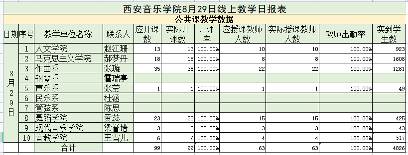8月29日, 公共大课实开99节,开课率100%,授课教师63人,学生出勤4826人次。